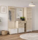 Elegancka garderoba do przedpokoju, która łączy ponadczasowy styl z wysoką funkcjonalnością. Naturalna kolorystyka drewna w zestawieniu z kontrastującymi elementami tworzy harmonijną całość, dzięki której mebel doskonale prezentuje się zarówno w nowoczesnych, jak i klasycznych wnętrzach. Przemyślany układ zapewnia komfort codziennego użytkowania — pojemne szafki pozwalają wygodnie przechowywać odzież, obuwie i akcesoria, praktyczne szuflady ułatwiają organizację drobnych przedmiotów. Solidne wykonanie oraz staranne wykończenie gwarantują trwałość i estetyczny wygląd przez długie lata. Garderoba stanowi idealne rozwiązanie dla osób, które cenią porządek, wygodę oraz elegancką aranżację przedpokoju już od pierwszego kroku do domu.